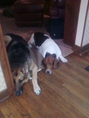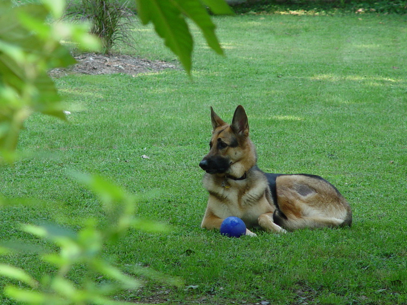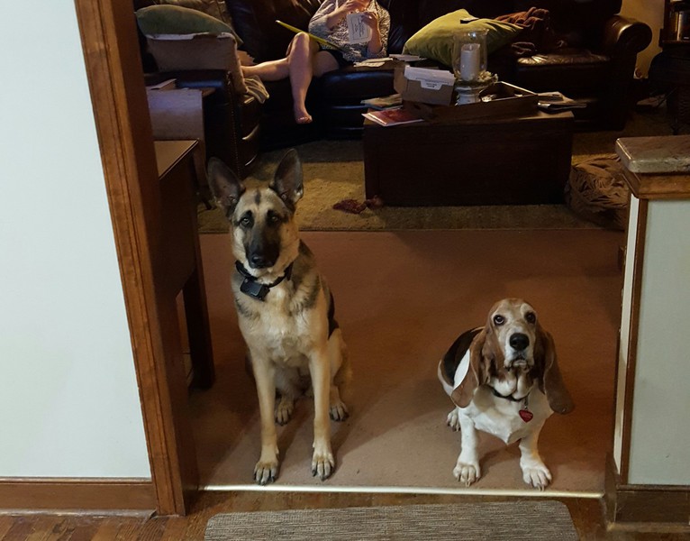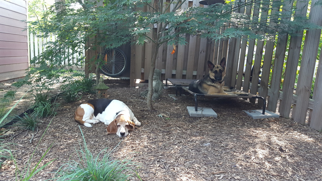 Abby, is the older German Shepherd, Charlotte is the younger. Krinkles is a rescued Basset Hound. Gizzy is a rescued Yellow-crowned Amazon Parrot. The pond puppies are .29 feeder fish from Petsmart.